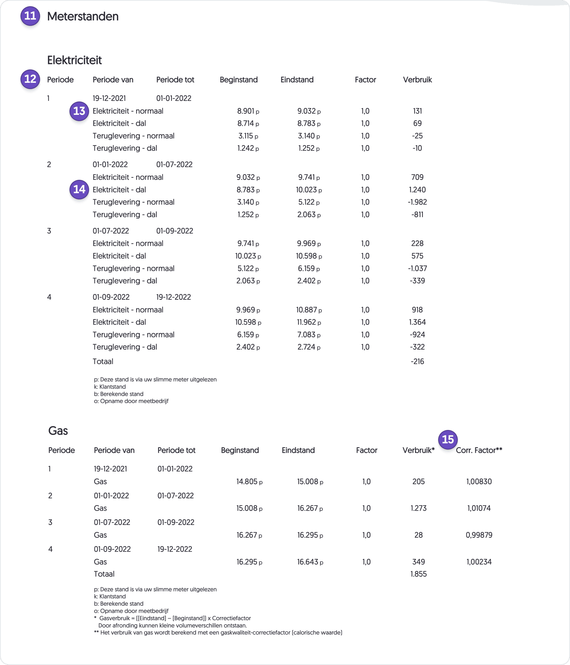 De meterstand op de gasmeter wordt achteraf gecorrigeerd voor calorische waarde en (eventueel) voor temperatuur en hoogteligging. De calorische waarde is de hoeveelheid energie in een kubieke meter (m³) gas. De netbeheerder stelt maandelijks de calorische waarde van het geleverde gas vast. Het volume van het geleverde gas is afhankelijk van de temperatuur in de gasmeter. Als de meter geen correctie toepast op de temperatuur van het geleverde gas, corrigeert de netbeheerder het met een standaardfactor.