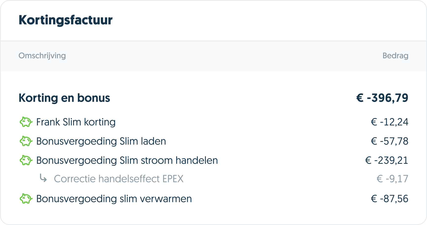 De facturatie van de energielevering of -teruglevering zal altijd bepaald worden op basis van de P4-data van je slimme meter. Bij de berekening van de handelsresultaten en de aan jou uit te keren bonus kijken we naar de prijsvorming op de EPEX-, onbalans- en, later, congestiemarkten en naar metingen gedaan door jouw thuisbatterij. Het resultaat van die berekeningen is een uit te keren bedrag in EUR, welke aan je wordt gecrediteerd in een (aparte) kortingsfactuur. Op die factuur worden geen kilowatturen getoond of in rekening gebracht.