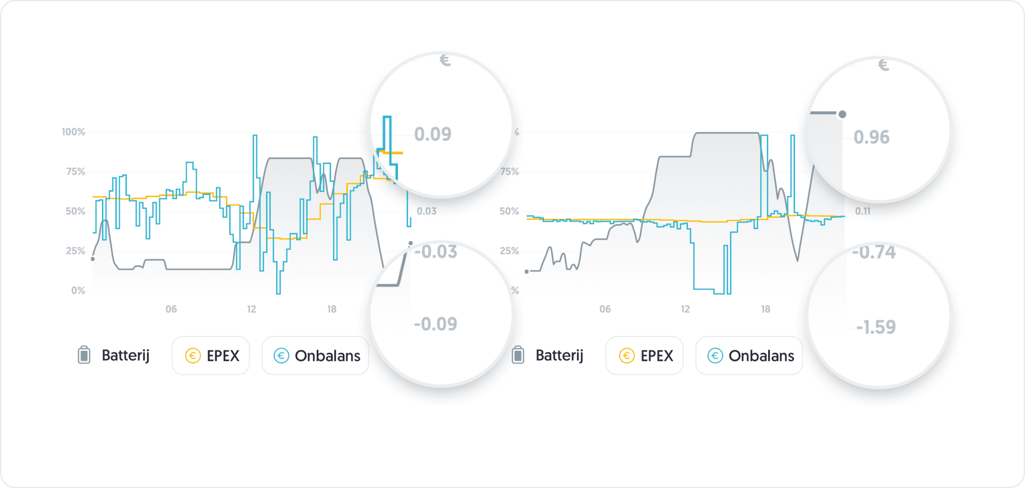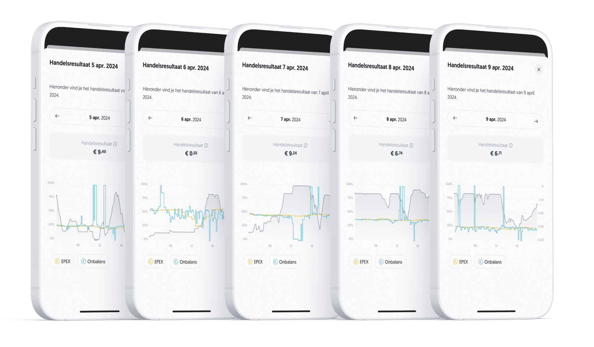 Om je een idee te geven bij de handelsstrategie die we hanteren, tonen we in de app naast je batterijpercentage ook de EPEX- en onbalansprijzen. Ook leggen we ieder kwartier van de dag aan je uit wat onze strategie is. Zo kun je min-of-meer live volgen waarom je batterij op dit moment aan het laden of ontladen is. De onbalansprijzen die we tonen zijn de prijzen behorend bij “regeltoestand 1” die elke minuut worden ververst door TenneT. De feitelijke onbalans wordt door TenneT pas op de volgende werkdag bepaald en wel op de “15 min. effectieve onbalansprijzen”. Dit is de reden waarom we in het scherm van vandaag geen handelsresultaten kunnen tonen (maar pas op de volgende werkdag). Ook kan het gebeuren dat de landelijke balans binnen een kwartier van overschot naar tekort (en weer terug) beweegt. In zo’n situatie ontstaat “regeltoestand 2” en wordt een tweede reeks onbalansprijzen toegepast. We tonen maar één onbalansprijsreeks in de app omdat het anders te complex wordt. Prijzen voor andere producten op de onbalans- en congestiemarkt (zodra we je batterij daar kunnen inzetten) tonen we om diezelfde reden niet. Ons algoritme zal hoe dan ook een economisch optimum bepalen en de handelsresultaten keren we aan je uit.